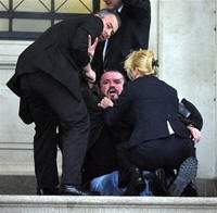 Primero la sorpresa: un oscuro paramilitar pro-británico, Michael Stone, irrumpió en la sede de la Asamblea legislativa y lanzó una bolsa con seis artefactos explosivos, al grito de «¡nunca nos rendiremos!», antes de ser reducido por la seguridad. Por fortuna, las bombas fueron desactivadas y no hubo que lamentar víctimas.