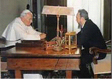 Then, Fidel introduces the members of his delegation to the Pope, and following the traditional protocol, they exchange gifts. The Pope gives Fidel a triptych of the medals of his pontificate, in bronze, gold and silver. For his part, the Cuban president gives him a sea shell incorporated into a sliver sculpture.