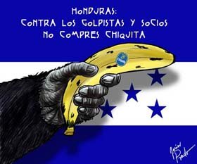 EL TERROR DESDE EL PODER REAL Uno de los presidentes de la United Fruit, Sam Zemurray, es el autor de una frase de principios del siglo XX, que refleja la temprana calaña de la compañía: "En Honduras es más barato comprar un diputado que una mula". Su primer golpe de Estado fue precisamente en ese país, para imponer la reposición del presidente exilado Manuel Bonilla, lo cual logran en 1912. Bonilla pagó el "favor" al otorgarle 10 000 hectáreas libres de impuestos. En esos años en Costa Rica, la United Fruit apuntalaba sus negocios con Cleto González, el que fue derrocado por un golpe de Estado en 1917. En apoyo a la compañía, el gobierno estadounidense no reconoció al nuevo presidente. En Colombia, la United Fruit pidió al Ejército reprimir a 3 000 trabajadores de la empresa que llevaban un mes en huelga en 1928. Se les calificaba de comunistas. El cónsul de EE.UU. en el país reportó casi 600 víctimas. Cuando el presidente Jacobo Arbenz nacionalizó en Guatemala las propiedades de la United Fruit, el golpista elegido Castillo de Armas, estaba vinculado a la compañía. No es casual que partió desde plantaciones de la United Fruit en Honduras. "Restablecido" el orden en Guatemala en 1954, la transnacional también cedió allí sus terrenos para que la CIA organizara la invasión a Cuba en 1961. Quería recuperar sus más de 100 000 hectáreas. Ya para esa etapa, directivos de la United Fruit se rotaban los más altos cargos en el gobierno y la CIA. El caso de los hermanos Dulles, secretario de Estado y director de la CIA, indistintamente, es el más conocido. No fueron los únicos. John Moors Cabot, secretario de Estado, hermano de Thomas Cabot, fue presidente de la United Fruit. Bedell Smith, subsecretario de Estado y ex director de la CIA, fue miembro del directorio de la United Fruit. Henry Cabot Lodge, senador y representante de EE.UU. ante las Naciones Unidas, era accionista de la United Fruit. Hasta Anne Whitman, secretaria personal del presidente Eisenhower, estaba casada con el jefe de Relaciones Públicas de la United Fruit. La lista es casi interminable. CHIQUITA BRANDS: EL IMPERIALISMO BANANERO En 1970, la United Fruit se fusionó nada menos que con Zapata Corporation, fundada por la fascista familia de los Bush, y pasó a llamarse United Brands. En 1990 volvió a cambiar de nombre, para convertirse hasta hoy en Chiquita Brands. En Colombia y Honduras —¡qué casualidad!— la compañía prosiguió sus prácticas y penetró el poder de estos países hasta los tuétanos. Desde 1997, Chiquita Brands pagó millones de dólares a las AUC (Autodefensas Unidas de Colombia), grupo paramilitar colombiano. Les transportó las armas en sus barcos y dio órdenes para que eliminaran a dirigentes campesinos y sindicalistas, que se le enfrentaban. La cifra de esta escalada de violencia no está determinada. No es hasta diez años después, en el 2007, que admite su felonía y paga una multa de 25 millones de dólares por decisión de una corte estadounidense. El acuerdo incluía no revelar a los ejecutivos implicados. El tema extradición escaló a los presidentes Bush y al colombiano Álvaro Uribe. Este último, defendió a Chiquita Brands. ¿Por qué? Varias informaciones, entre ellas un artículo publicado en Internet el 24 de marzo del 2007 por la prensa digital Argenpress titulado, Todos los caminos conducen a Washington, indican que cuando el ganadero Uribe aspiró a su candidatura como Gobernador en Antioquia recibió dinero de esta transnacional. Pero es en Honduras donde la compañía ha ido más lejos en el control del poder. El 9 de abril de 1975, el Wall Street Journal publicó que Chiquita Brands confesó haberle pagado 1 250 000 dólares a un alto funcionario hondureño para obtener concesiones arancelarias y declaró que sus actividades eran estimuladas por el Departamento de Estado norteamericano. Esto último fue rápidamente desmentido por un vocero. En 1975, una investigación de la U.S. Securities And Exchange Commission reveló que la United Brands había sobornado al presidente de Honduras, Oswaldo López Arellano, con el fin de lograr rebajas en sus impuestos por exportación. López Arellano ya había dado un golpe de Estado al anterior presidente, que pretendió una reforma agraria que afectaría a la compañía. A inicios de los 80, Reagan indica a la CIA derrocar al gobierno nicaragüense mediante acciones paramilitares. Honduras fue su base principal. El general hondureño Gustavo Álvarez Martínez participó como si fuese plantilla del Pentágono. Claro, desde 1975 recibía pagos de la United Brands. La United Brands aún tenía poder durante la década del 90 para desalojar aldeas en Honduras y colocar pesticidas de alto riesgo prohibidos en Estados Unidos. Hoy tiene mujeres y niños que se exponen a productos químicos nocivos para la salud, en jornadas de 12 horas en los campos de cultivo. El 25 de agosto del 2009, el ex oficial de Inteligencia de Estados Unidos y actual activista contra la corporatocracia, John Perkins, escribió el artículo Honduras: Military Coup Engineered By Two U.S. Companies? (¿Golpe de Estado planificado por dos empresas estadounidenses?), donde refiere que muchas personas estaban convencidas que dos empresas de EE.UU., con el apoyo de la CIA, habían tramado el golpe. Una de ellas, Chiquita Brands. Perkins y otras fuentes dentro de Honduras confirman que Chiquita Brands criticó duramente a Zelaya por anunciar que el salario mínimo aumentaría en un 60%, alegando que la medida provocaría millonarias pérdidas. Cuando se oficializó el decreto, la compañía apeló al COHEP (Consejo Hondureño de Empresa Privada) y encontró el eco y la confabulación que quería. Una coincidencia. La firma de abogados Covington & Burling LLP, representa a Chiquita Brands, quien en los últimos tres años le ha pagado decenas de miles de dólares a través de gastos de cabildeo. El actual fiscal general y secretario de Justi