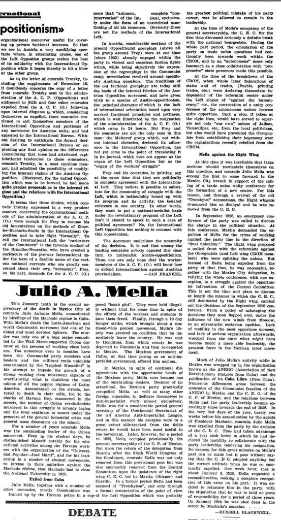 ![]() from the January 15, 1931 issue of The Militant: Julio A. Mella [by Russell Blackwell] This January tenth is the second anniversary of the death in Mexico City of comrade Julio Antonio Mella, assassinated by hirelings of the Machado regime in Cuba. With Mella's death the Latin-American and world Communist movement lost one of its ablest and most devoted fighters. The murder was only one of a long series committed by the Wall Street-supported Cuban dictator on the persons of working class leaders. Too numerous even to mention have been the Communist party members and leaders and the militant trade unionists assassinated by the "tropical Mussolini" in his attempt to impede the growth of a strong working class movement capable of overthrowing what is doubtless the most odious of all the puppet regimes of Latin America. Assassinated on the streets, tortured to death in their cells, fed to the sharks of Havana Bay, massacred in the streets, the number of Cuban revolutionists murdered in this struggle is already legion and the total continues to mount under the pressure of the general industrial crisis and general mass discontent on the island. For a number of years comrade Mella was the outstanding leader of the Cuban movement. Even in his student days, he distinguished himself notably for his educational activities among ;the Havana workers with the organization of the "Universidad Popular-Jose Marti", and for his leadership in a number of student movements so intense in their agitation against the Machado regime that Machado had to close the National University in 1925. Julio Mella, together with a number of other comrades, mostly Communists, was framed up by the Havana police in a supposed "bomb plot". They were held illegally without trial for some time in spite of the efforts of the workers and students to have them freed. Finally, through a 19 day hunger strike, which brought about a continent-wide protest movement, Mella's liberty was granted on condition that he immediately leave the country. He was sent to Honduras, from which county he was deported to Guatemala and, then re-deported to Mexico. The Mexican government of Calles, at that time posing as an anti-imperialist government, offered him asylum. In Mexico, in spite of continual disagreements with the opportunist heads of the Mexican party, Mella soon became one of the outstanding leaders. Because of instructions the Mexican party practically compelled Mella, as well as many other foreign comrades, to dedicate themselves to anti-imperialist work almost exclusively. Mella was for a considerable period general secretary of the Continental Secretariat of the All America Anti-Imperialist League, and in this manner his energies were to a great extent side-tracked from the fields where he would have been most useful to the movement. Later, however, for a period in 1928, Mella occupied provisionally the general secretaryship of the C. P. of Mexico. But upon the return of the delegation from Moscow after the Sixth World Congress of the Comintern, comrade Mella was not only removed from this provisional post but was also summarily removed from the Central Committee, upon the insistence of the right wing C. E. C. led by Martin (Stirner) and Carrillo. In a former period Mella had been accused of "Trotskyism", and only through a formal renunciation of the point of view of the Left Opposition which was probably the greatest political mistake of his party career, was he allowed to remain in the leadership. Exiled from Cuba At the time of Mella's occupancy of the general Secretaryship, the C. E. C. for the first time discussed seriously a definite break with the national bourgeoisie. During the whole past period, the orientation of the party on trade union questions had continually been towards work within the CROM, and in an "autonomous" sense only insomuch as a close collaboration with "progressive" state governors made this possible. At the time of the breakdown of the CROM, when whole labor federation of states and of trades, (Puebla, printing trades, etc.) were declaring themselves independent of the reformist center under the Left slogan of "against the bureaucracy," etc., the convocation of a unity conference of the autonomous unions became quite opportune. Such a step, if taken at the right time, Would have served to separate not only "Our Own" unions of Jalisco, Tamaulipas, etc., from the local politicians, but also would have prevented the Obregonists from establishing their hegemony over the organizations recently rebelled from the CROM. Mella against the Right Wing At this time it was inevitable that large sections should reorientate themselves on this question, and comrade Julio Mella was among the first to come forward in the Mexico City branch in support of the calling of a trade union unity conference for the formation of a new center. For this reason, and through a revival of the old "Trotskyist" accusations, the Right wingers denounced him as disloyal and he was removed from the C. E. C. In September 1928, an emergency conference of the party was called to discuss the change in the political situation. At this conference, Martin demanded the expulsion of Mella for the crime of working against the party line in the direction of "dual unionism." The right wing proposed a united front with the reformists against the Obregonists (and Left wing CROM members) who were splitting the unions. But instead of Mella being expelled from the party at that time, he was successful, together with the Mexico City delegation, in rallying the whole conference, with one exception, to a struggle against the opportunist tail-endism of the Central Committee. This is not the time and place to discuss at length the manner in whole the C. E. C. still dominated by the Right wing, carried out the decisions of the September 1928 conference. From a policy of sabotaging the decisions they soon flopped over, under the influence of the new winds from Mo
