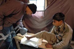 In the tent hospital located in Data, in the Mansehra district, Omer and Nasir, 14 and 13 years old, can be seen moving daily between the hospital ward tent and the tent set up for rehabilitation therapy and physiotherapy. They are from Balakot and, as a result of the earthquake, both lost a limb. Omer Zeb suffered the unimaginable tragedy of realizing that his little sister, squeezed against his chest under the collapsed roof of their house, had died. Nasir Crujjar lost his entire family to the earthquake.