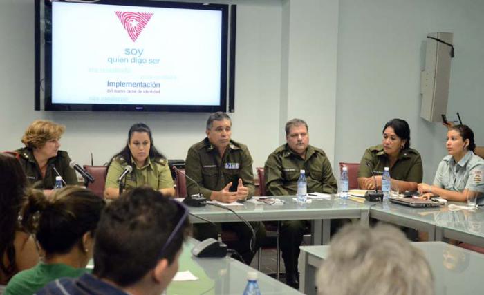 El nuevo documento de identidad, que comenzará a entregarse por La Habana, para extenderse paulatinamente al resto del país, da continuidad a la aplicación de los Lineamientos de la Política Económica y Social del Partido y la Revolución, y es el resultado del proceso de modernización tecnológica desarrollado por el Ministerio del Interior, que incluye el Sistema de Identificación vigente. Quienes hoy poseen el Carné de Identidad en formato de libro y de tarjeta plasticada en buen estado de conservación no están en la obligación de cambiarlos, pues el nuevo modelo no sustituirá a los que en la actualidad están en posesión de la población, que circulará junto con estos. Por ello, se convoca a la población de La Habana, a acudir a nuestras oficinas, preferiblemente, a solicitar el servicio de trámite en caso ineludible para evitar molestias innecesarias. A través de los medios de comunicación masiva se dará a conocer, en los próximos días, más información de este importante proceso para el cual están creados los mecanismos que permitan atender las dudas y aclaraciones de la población. Dirección de Identificación, Inmigración y Extranjería (DIIE) http://www.granma.cu/cuba/2014-10-16/nuevo-carne-de-identidad-a-partir-del-29-de-octubre ![]() ![]() La implementación gradual del nuevo carné de identidad fue explicada por especialistas de la Dirección de Identificación, Inmigración y Extranjería (DIIE) del Ministerio del Interior en conferencia de prensa efectuada este miércoles, en la cual se abordaron las características del documento y su cronograma de ejecución. El coronel Mario Méndez Mayedo, primer segundo Jefe de la DIIE, remarcó que no resulta obligatorio cambiar el documento de identidad desde el inicio del proceso, pues coexistirán las versiones de cada una de las variantes de carné emitidas hasta el momento. Además, dijo, la tarjeta de menor no sufre modificaciones. Señaló que este formato de nuevo tipo resulta más duradero y seguro, pues reduce las posibilidades de suplantar identidades, al tiempo que podrá lograrse mayor integración y agilidad de los trámites en la medida en que el país desarrolle la informatización de la sociedad. ![]() Coronel