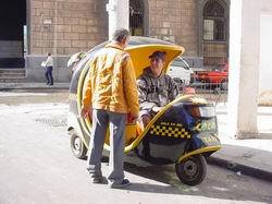 Gerardo Enríquez is a regular. “They are very useful, modestly-priced and they even take you to the door of your house”. However, “look there is no sign whatsoever; these three-wheel cars are overexploited; they have problems with spare parts and the story is that there are only ten working. I still have to see this here!”